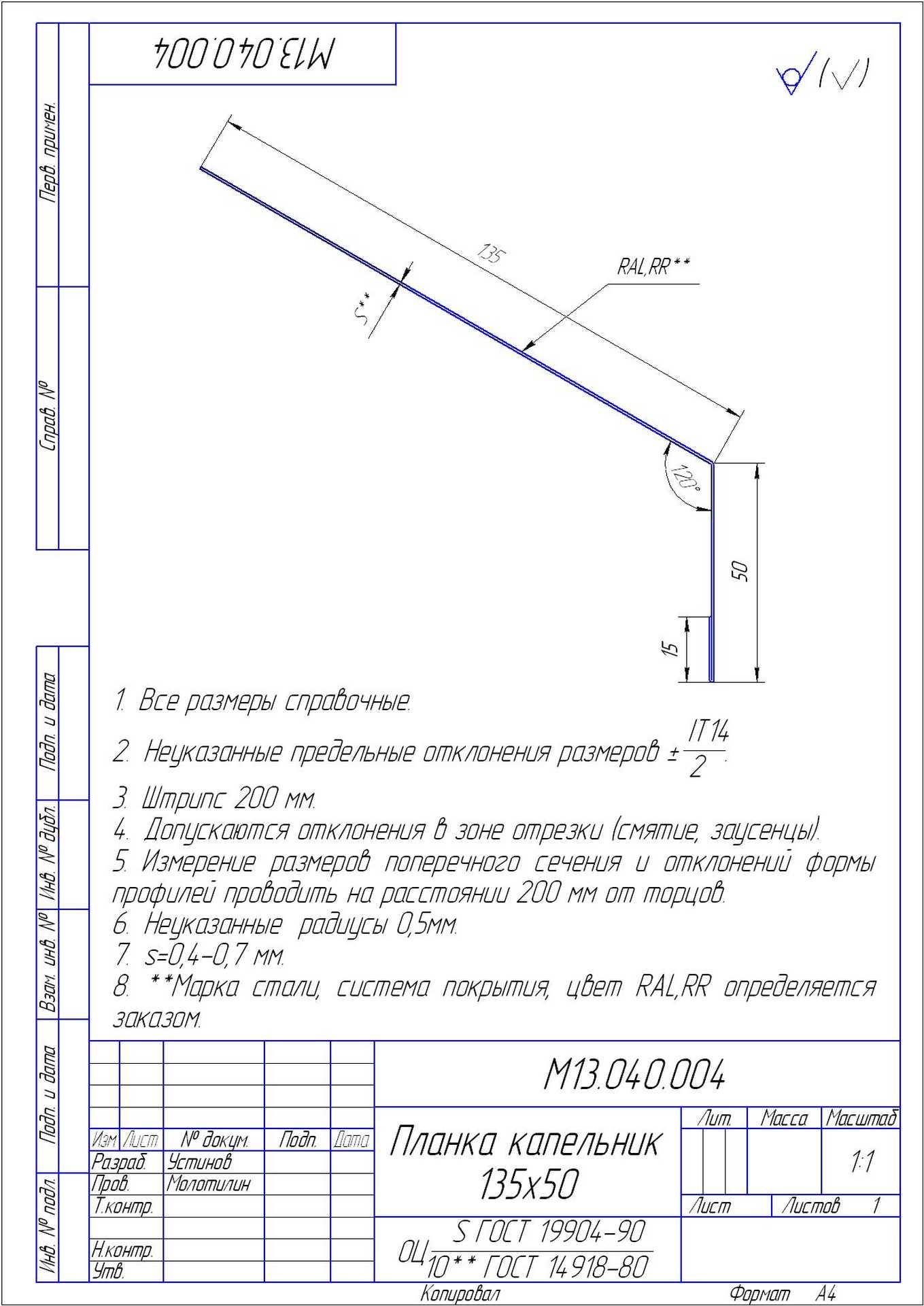 Планка капельник 135х50 0,4 PE с пленкой RAL 3005 красное вино